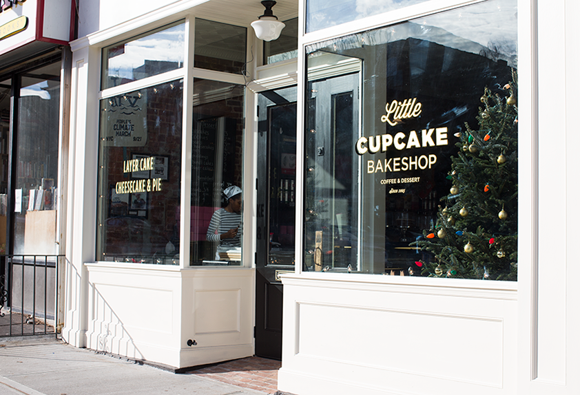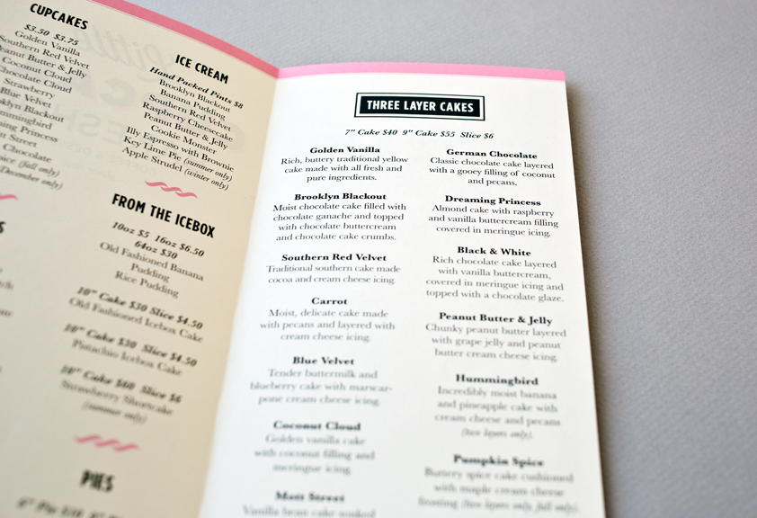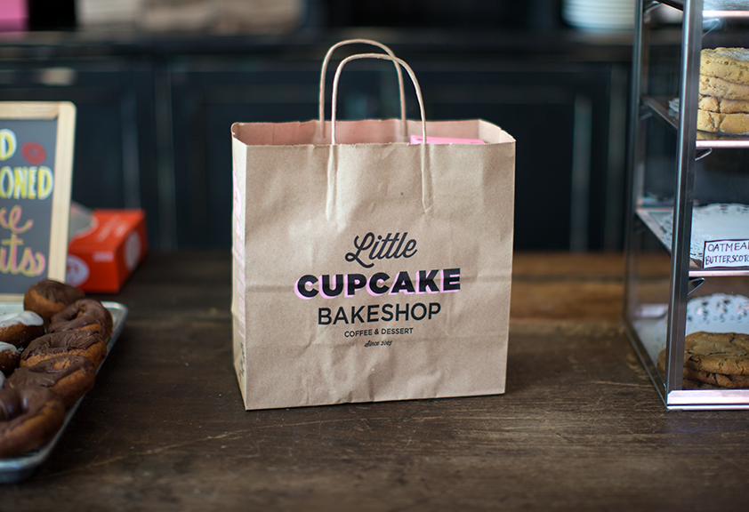 Identity design system for the Little Cupcake Bakeshop in New York city, including a logo, signage, menu, cups, bags, food packaging and website.
